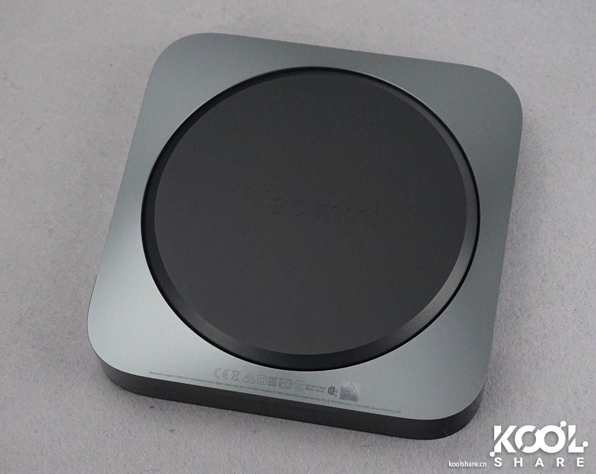 下面来看看Mac mini本体,这次Mac mini采用了近年很受大家欢迎的深空灰的配色。正面一个黑色的苹果Logo。